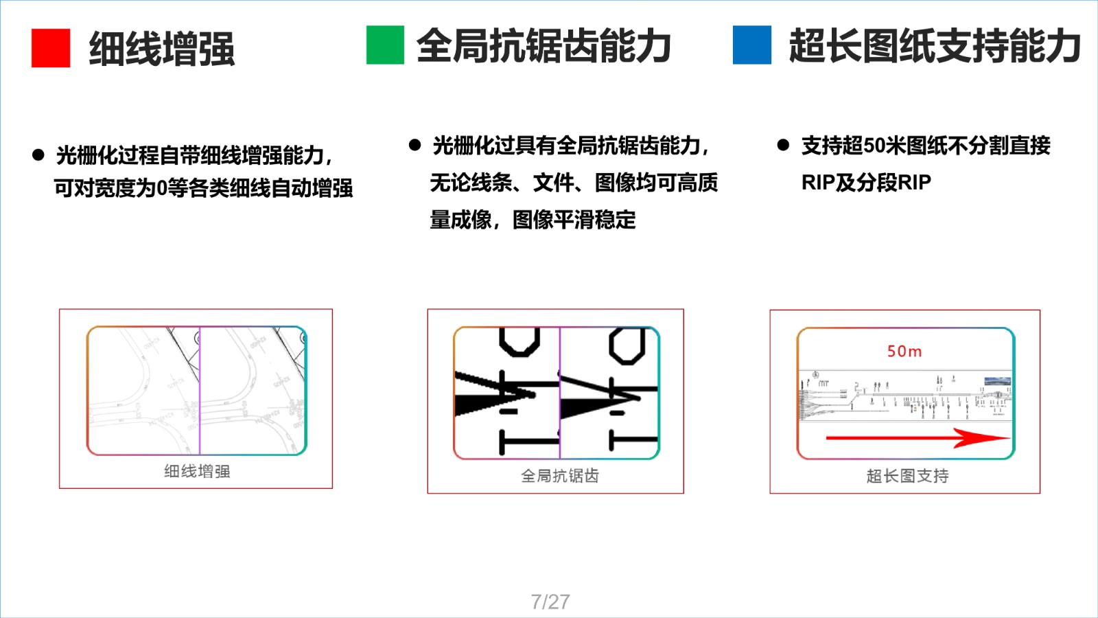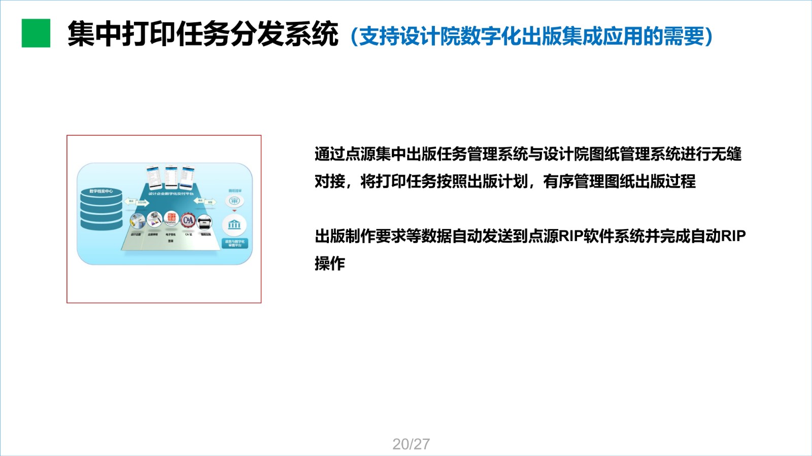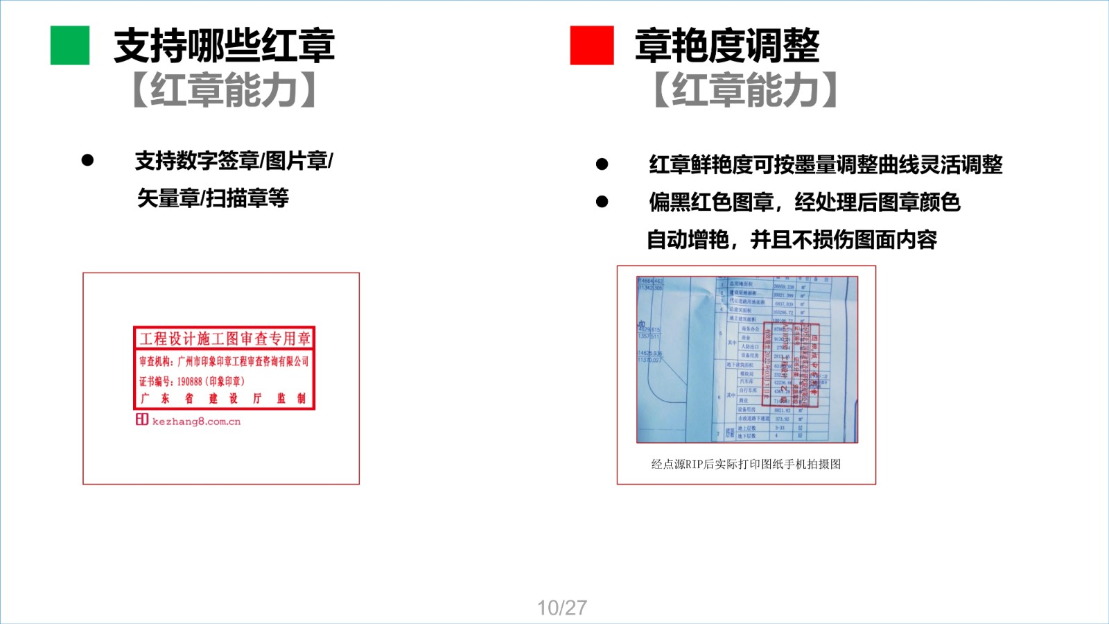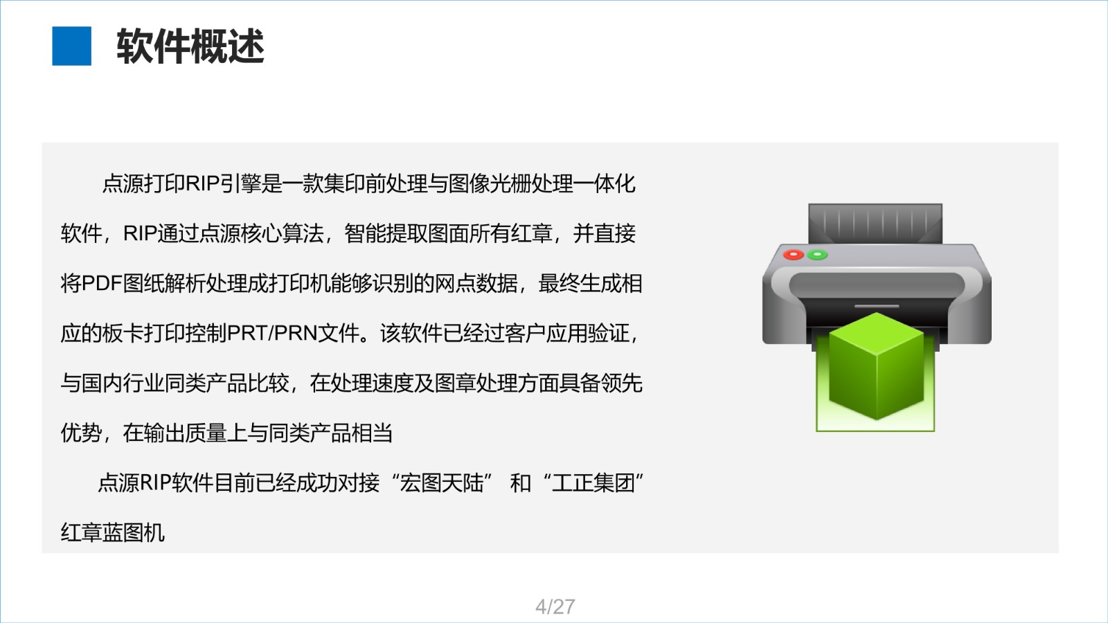 点源RIP软件是一款集印前处理与图像光栅处理一体化软件,RIP通过点源核心算法,能智能提取图面所有红章,并直接将PDF图纸解析处理成打印机能够识别的网点数据,最终生成相应的板卡打印控制PRN文件。该软件已经过客户应用验证,与国内行业同类产品比较,在处理速度及图章处理方面具备领先优势,在输出质量上与同类产品相当。