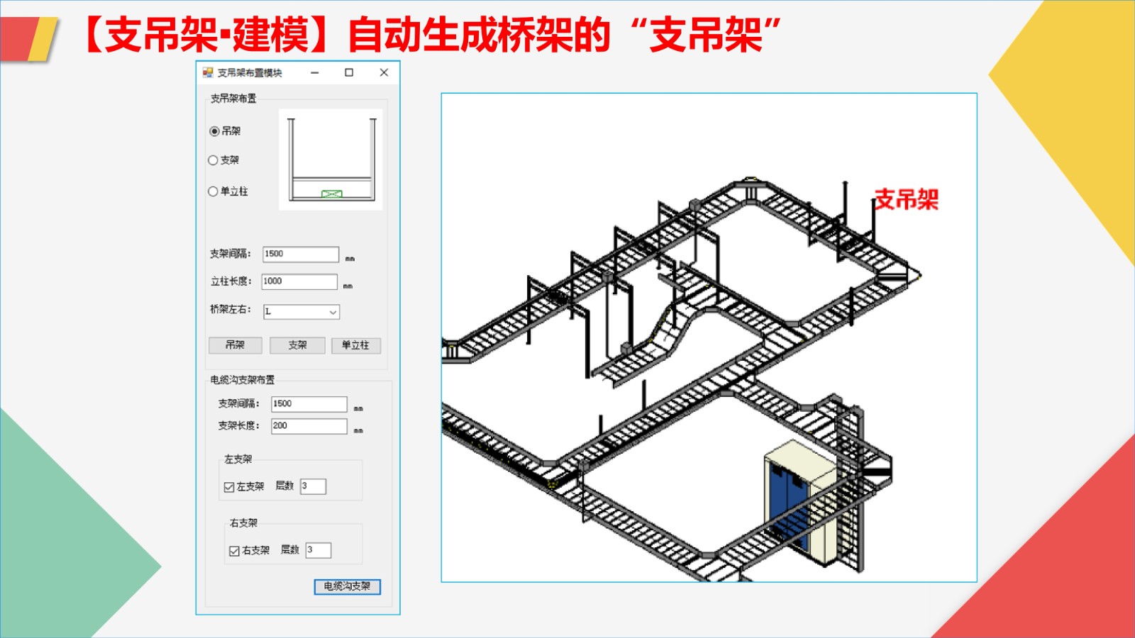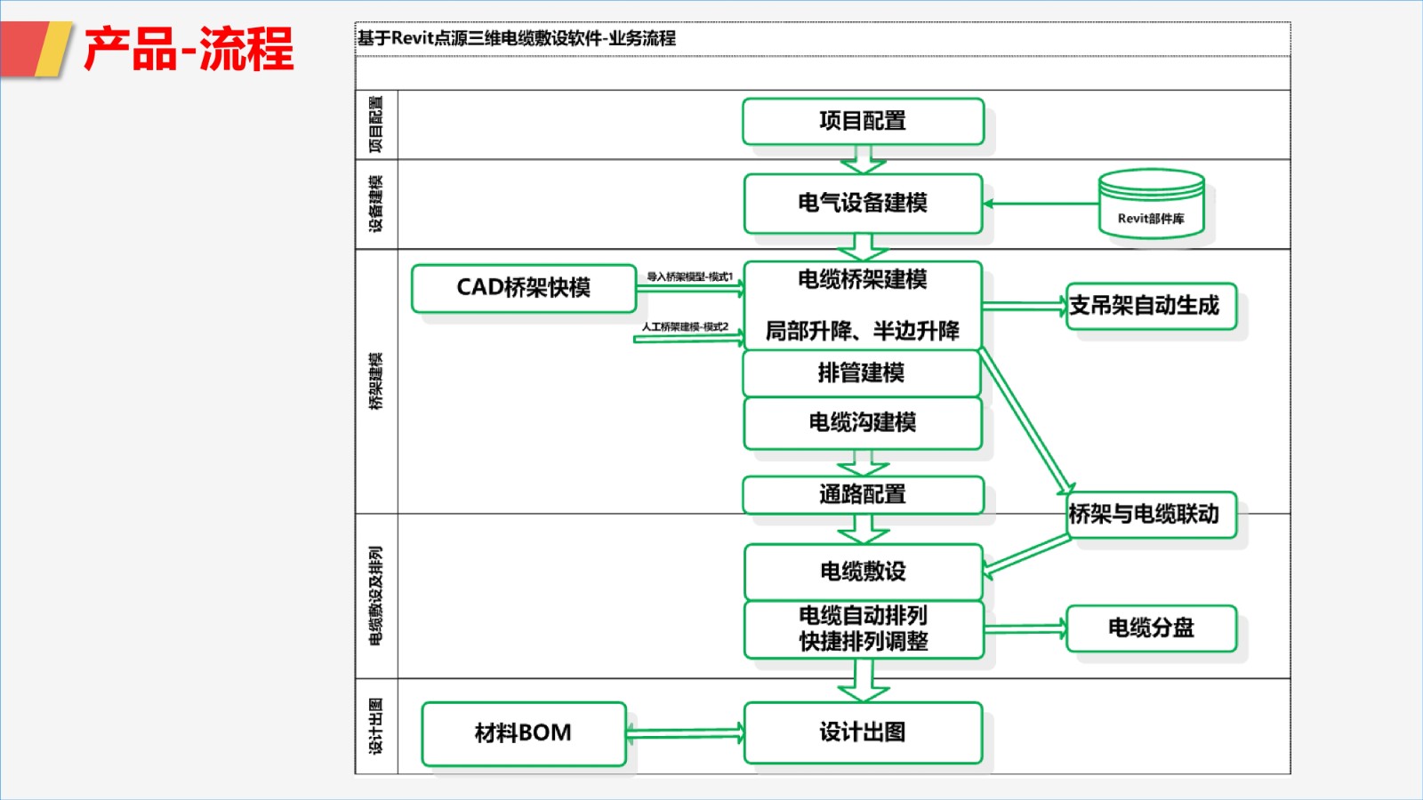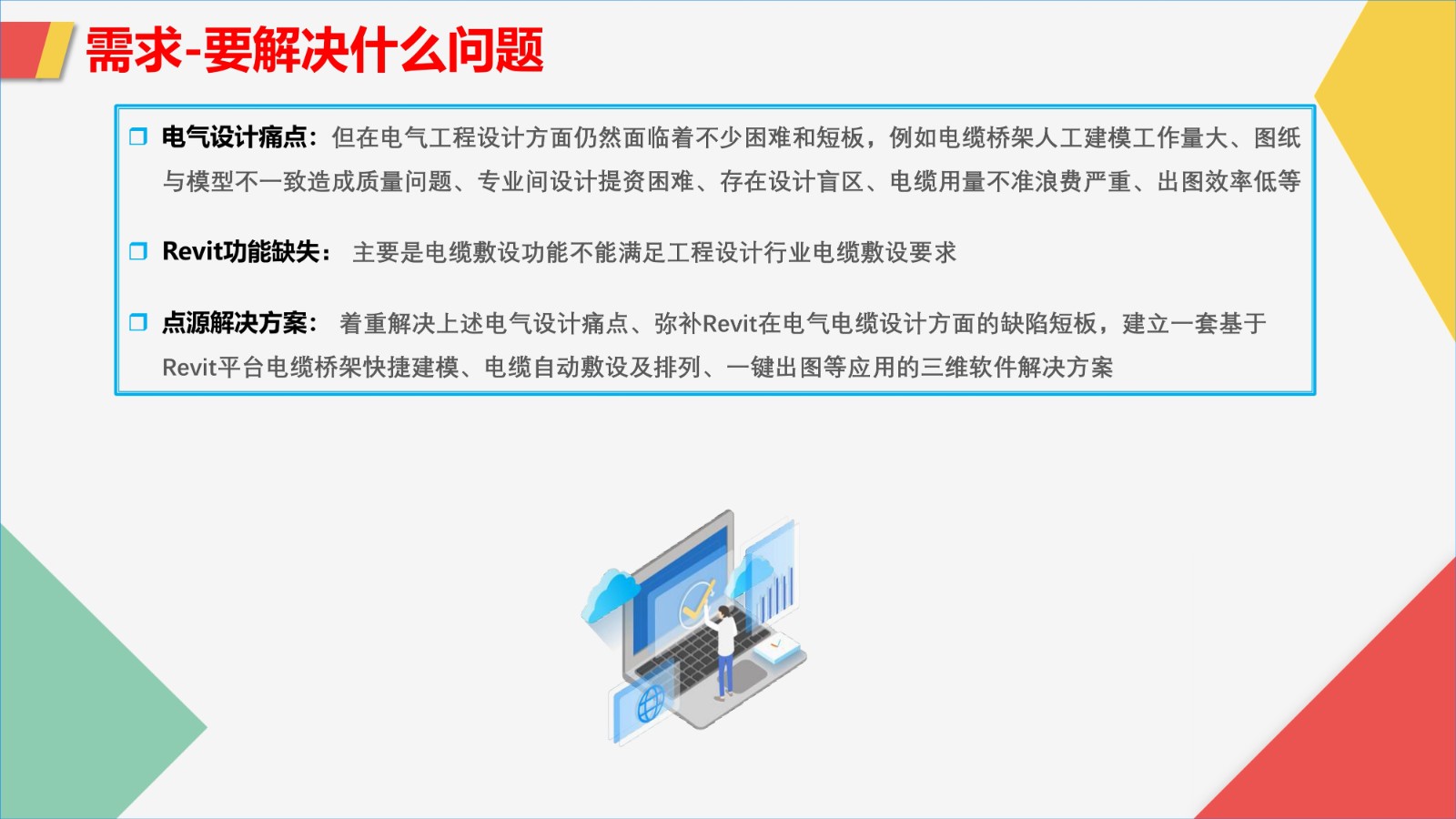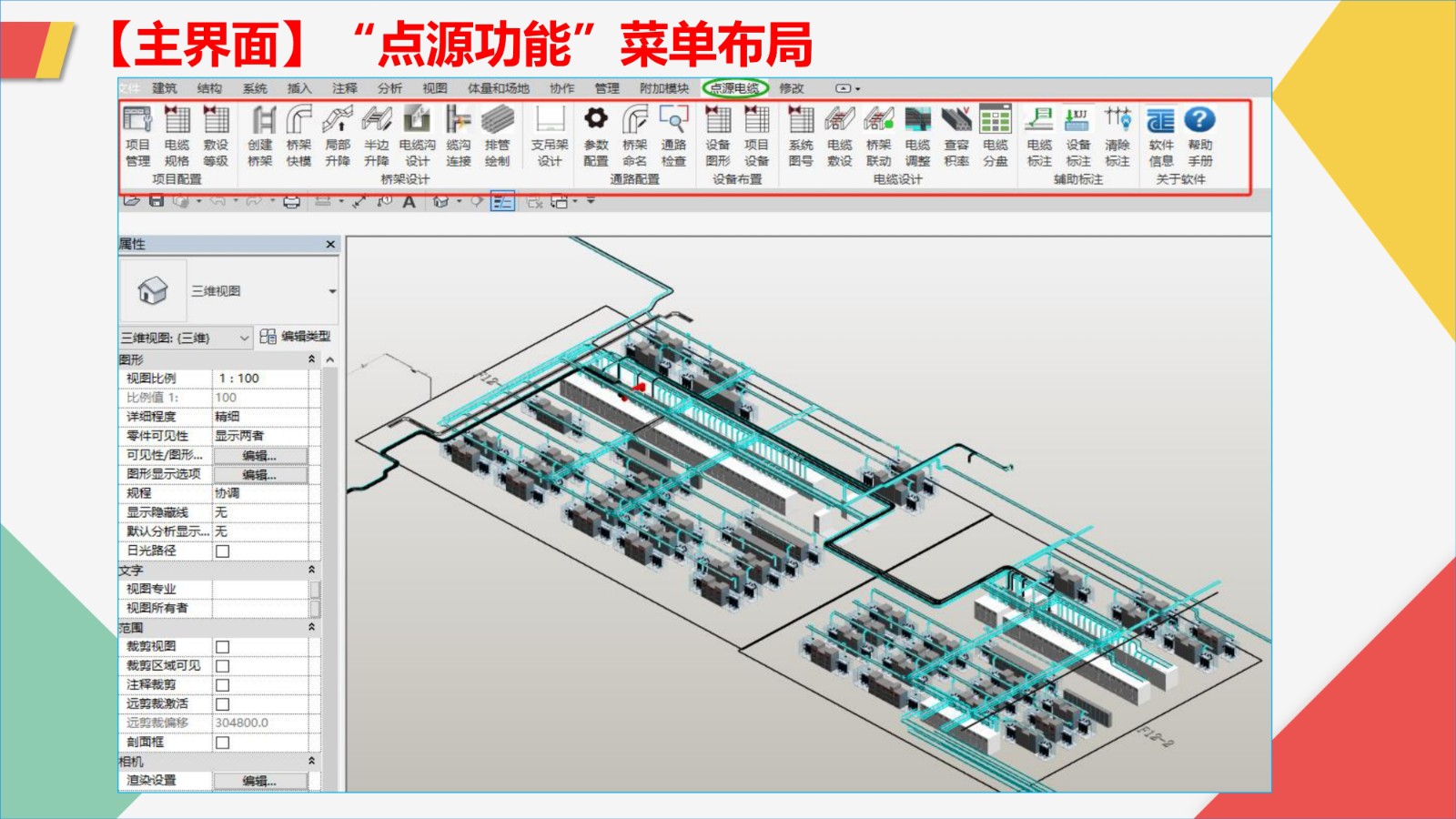 基于Autodesk公司Revit,点源插件可实现:【桥架翻模】AutoCAD桥架翻模成Revit三维桥架模型,【桥架修改】各桥架快捷命令批量快捷修改桥架;【电缆沟建模】快捷命令快速创建电缆沟;【支吊架生成】全自动生成支吊架;【电缆敷设】智能批量电缆敷设、电缆自动排列及调整,并生成订货清册;【设计出图】只要建有模型,就能快速出图