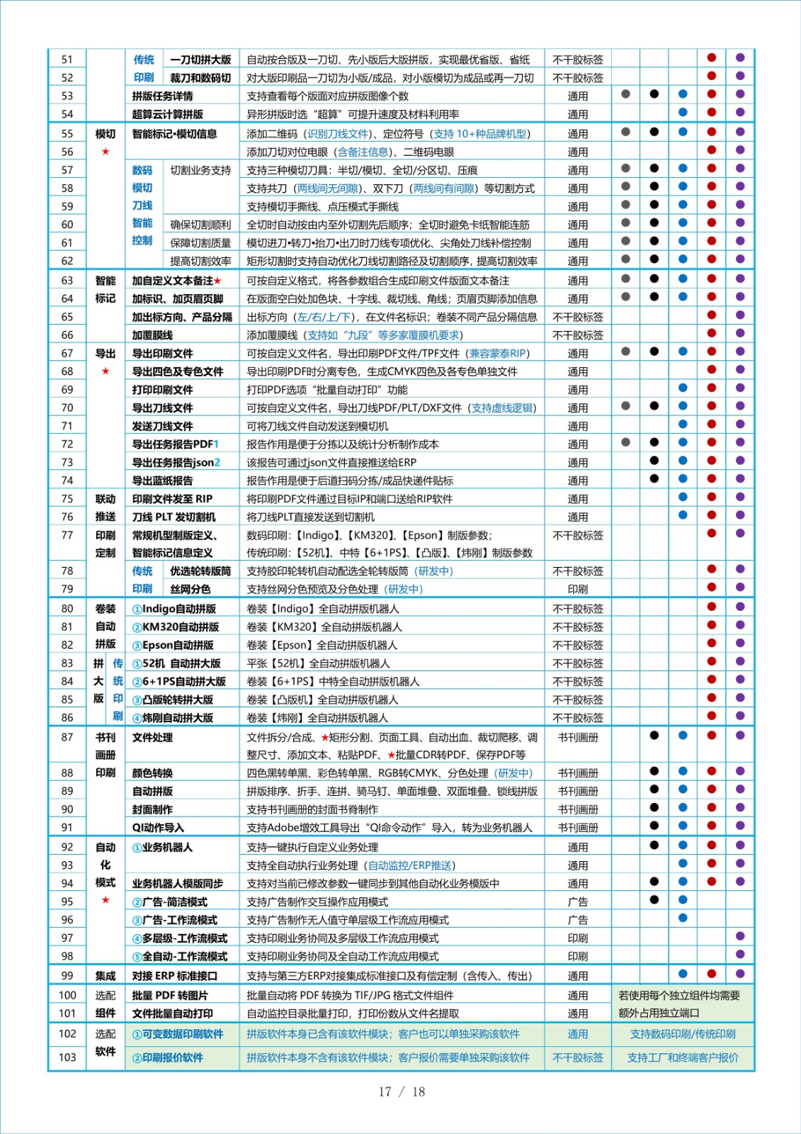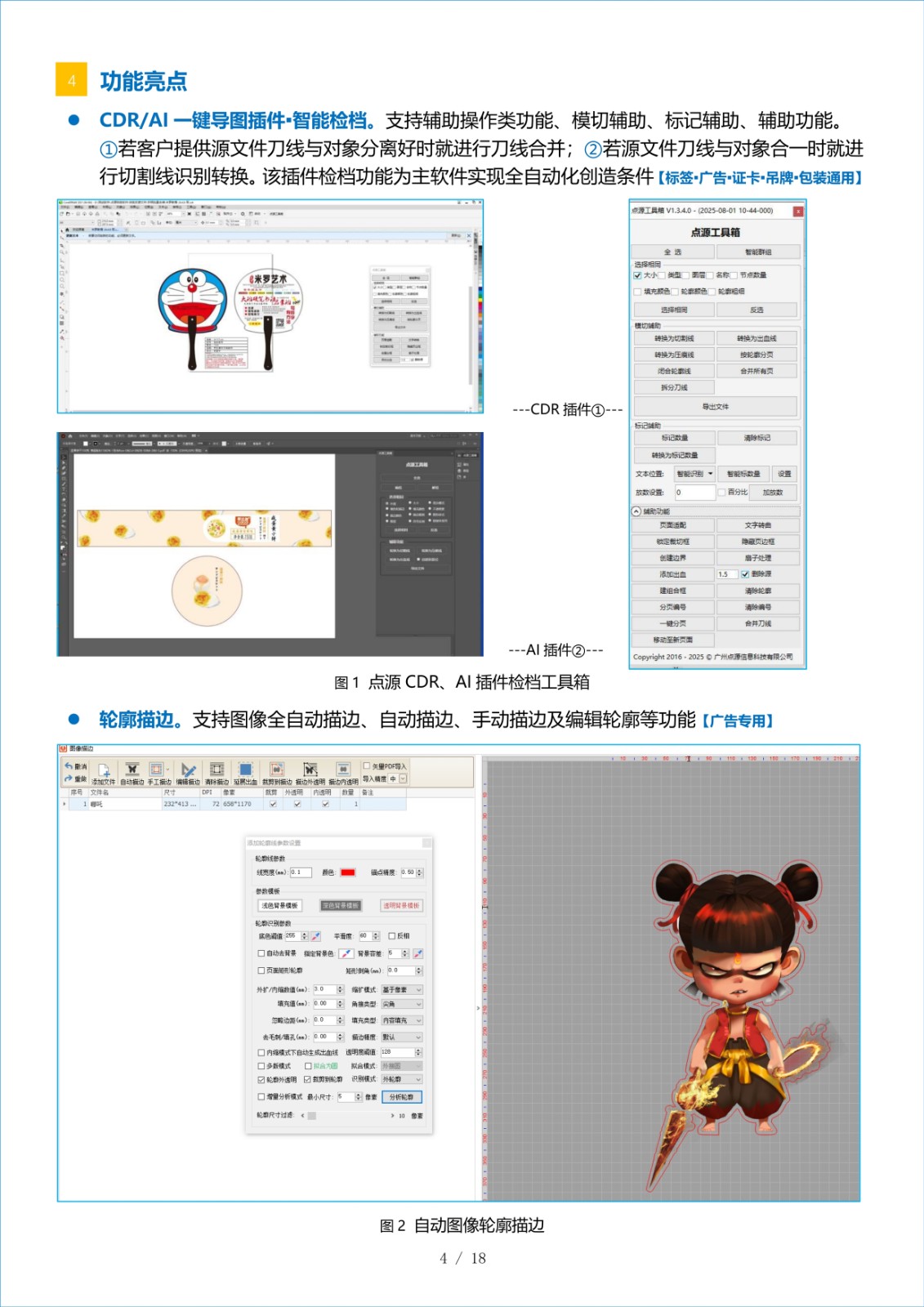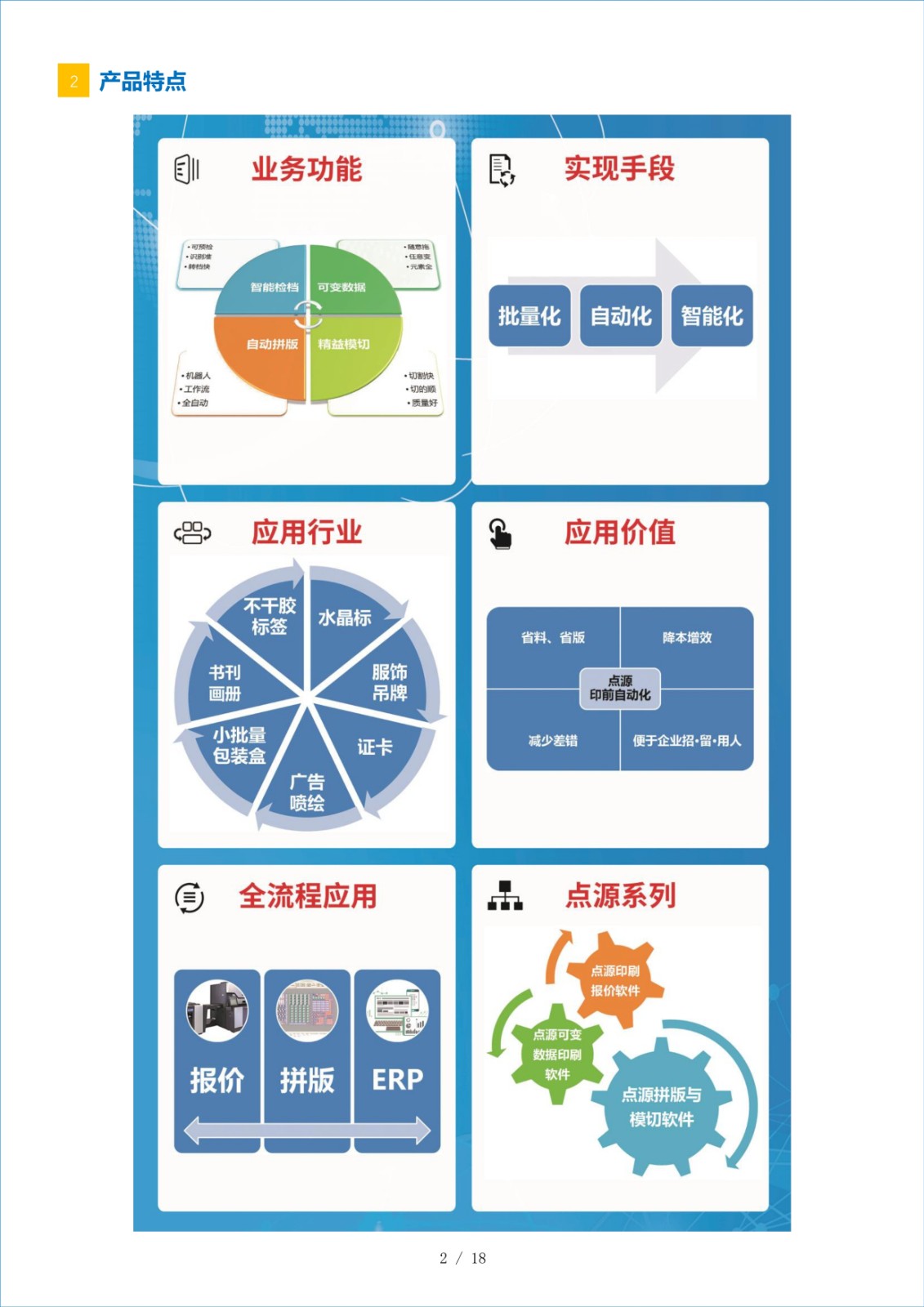 点源拼版与模切软件(印刷版) 印刷版是专门给印刷包装行业,针对数码印刷(含轮转)全自动应用的软件版本。印刷版软件不仅支持软件拼版全自动化业务应用,还支持对接ERP全流程应用。软件主要完成印前自动化包括智能检档、自动拼版及精益模切等全自动应用。 印刷版支持的印刷业务处理包括不干胶标签、小批量包装盒、书刊画册、服饰吊牌等。